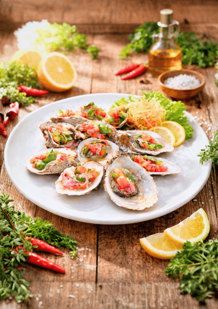 Tiram segar dengan tekstur lembut dan rasa laut yang khas di setiap sajian.