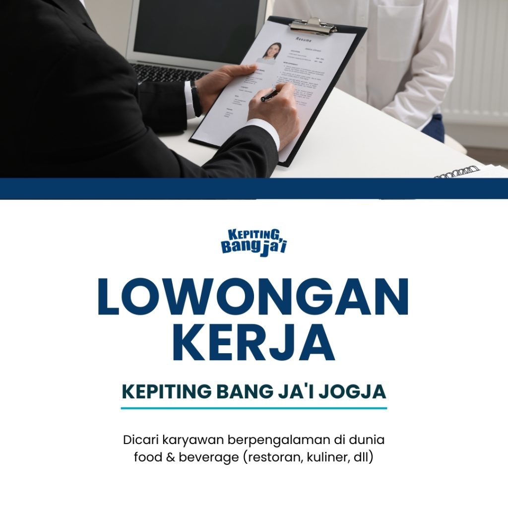 Kepiting Bang Ja’i dikenal sebagai restoran seafood terbaik di Yogyakarta. Melalui kerjasama puluhan talenta terbaik, kami berkomitmen memberikan layanan terbaik dan cita rasa yang autentik. Kini Kepiting Bang Ja’i membuka kesempatan bagi Anda yang bersemangat untuk meraih mimpi di dunia kuliner untuk bergabung bersama tim kami.